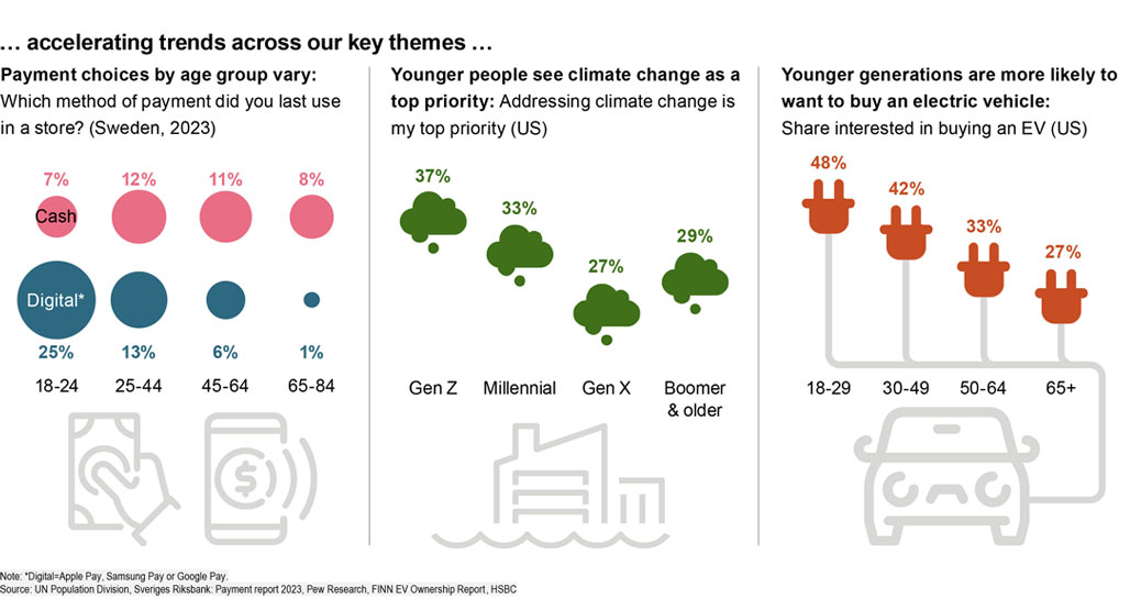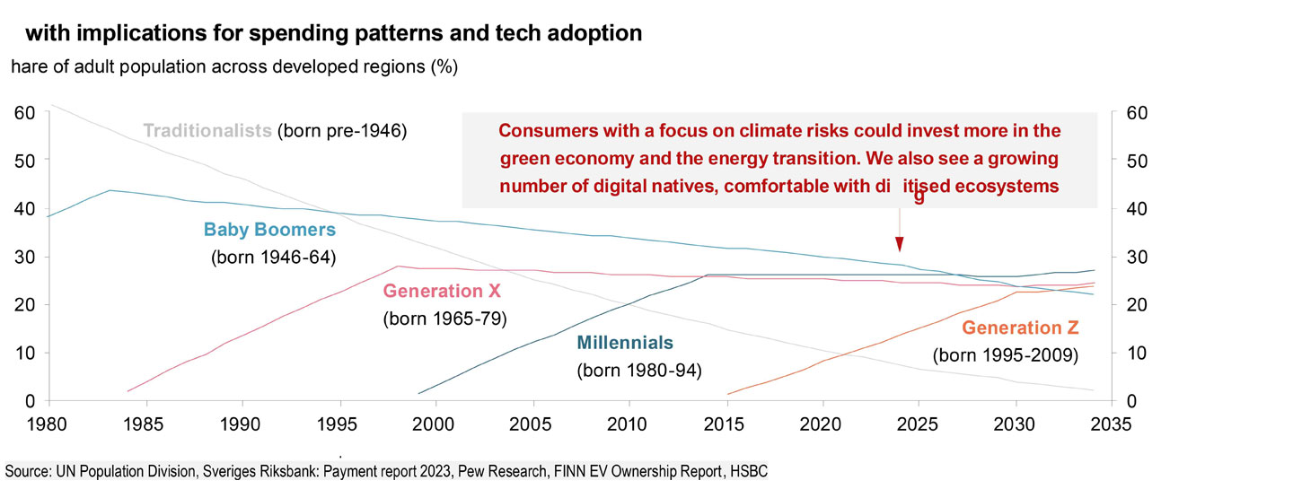 This ranges from technology adoption – which should happen more quickly due to intense cohort effects playing out in the global economy. We can add to that more people shopping online, using digital payments or potentially buying an electric (or autonomous) vehicle. A generation raised on the worries of climate change are likely to be key in accelerating the energy transition, with governments across the world pushed into policy choices to win votes from a growing cohort of the environmentally focused electorate.