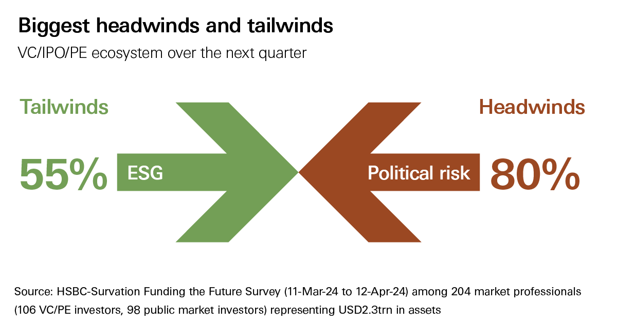 - Risks and catalysts: Political risks are the greatest concern of VC and listed investors, according to the survey, just ahead of the global rates environment. VC respondents see ESG as a tailwind rather than a headwind.