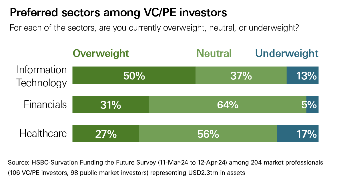 - Both institutional and VC investors are optimistic on tech and healthcare but have different perceptions of risks and opportunities