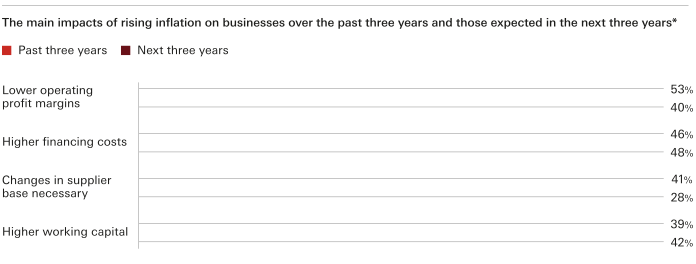 The impact of this, according to respondents, were the dual challenges of lower operating margins (53%) and higher financing costs (46%) – both of which are challenges that finance leaders expect to persist over the next three years.